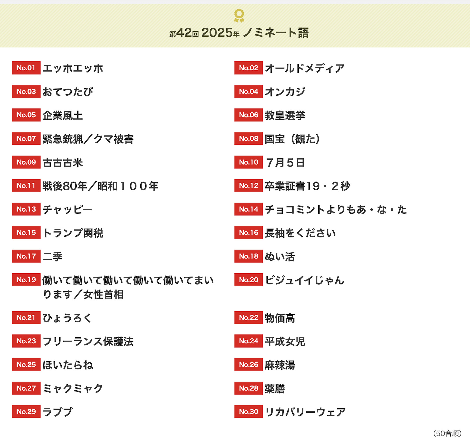 この中で大賞を取るのはなんですかね。「オールドメディア」はないな。メディアの体質から言って。。。忖度含めて「ミャクミャク」あたりかな。