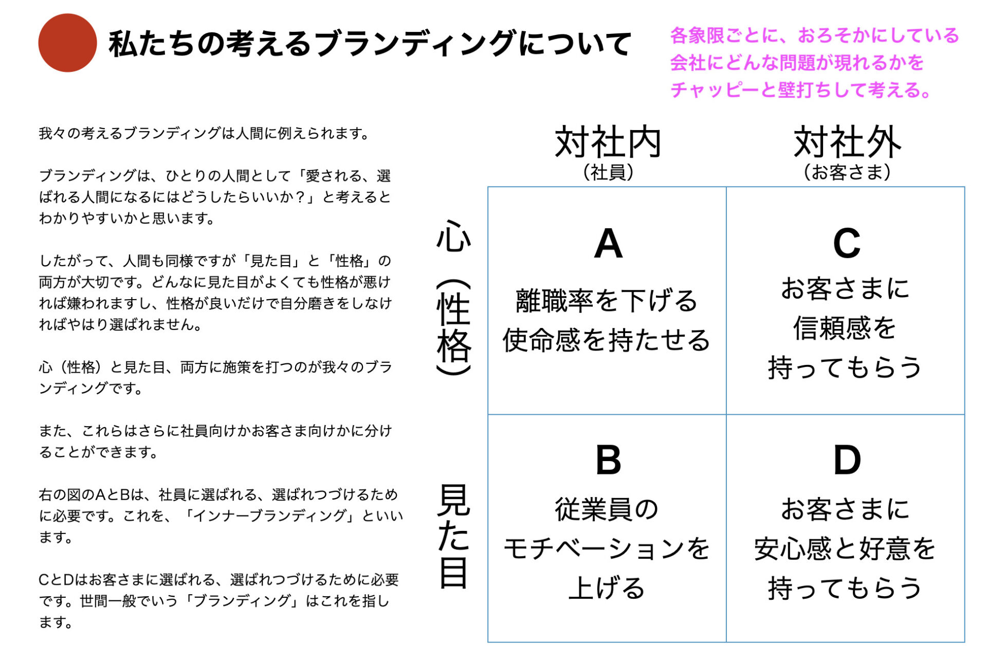 もう、ここに書いてあるとおりです。内も外も磨いていこうぜ、というのが本来のブランディングです。