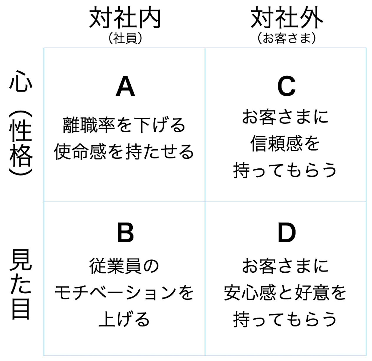 | B:対社内 × 見た目 | 自社への誇りが育たない。職場や資料や発信の雑さが士気を下げる。 |