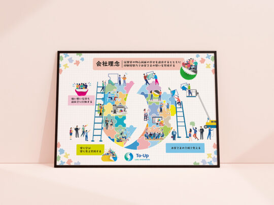 To-Upさまは会社の統合のタイミングで会社理念を共有するためにCIインフォグラフィックを作成しました。