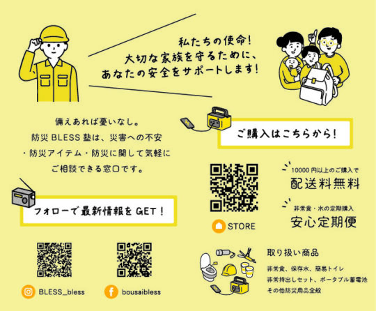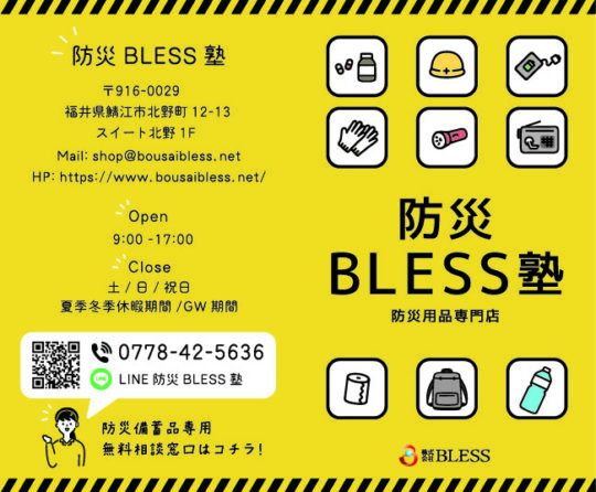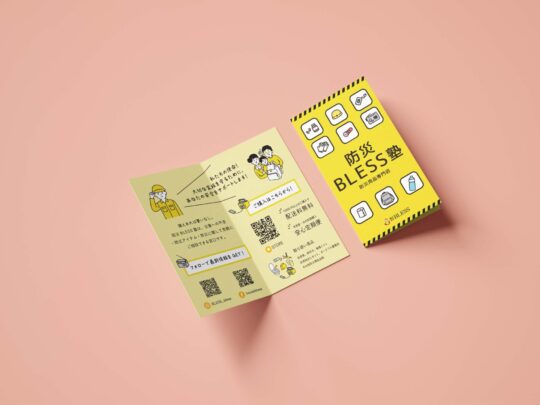 株式会社BLESSさまの新事業である防災グッズの販売を告知するビジネスカード、通称ビジカです。