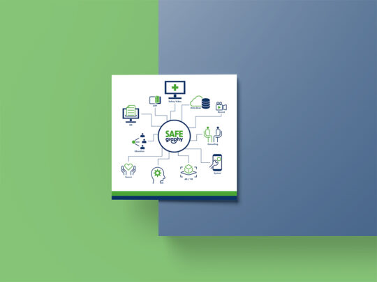 色や文字、画だけでなく“形”でも差別化を図り、セーフグラフィさまの建設業の安全を守る業務サービスを明るく親近感のあるデザインで表現しました。