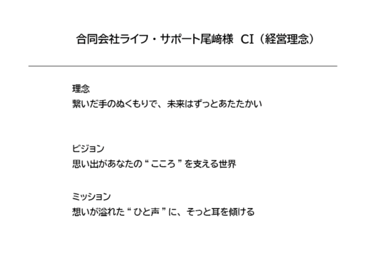 その対話を重ねる中で、お客様の想いや大切にされている価値観を一つひとつ丁寧に言語化し、最終的にはご納得いただけるCI(経営理念)として形にすることができました。